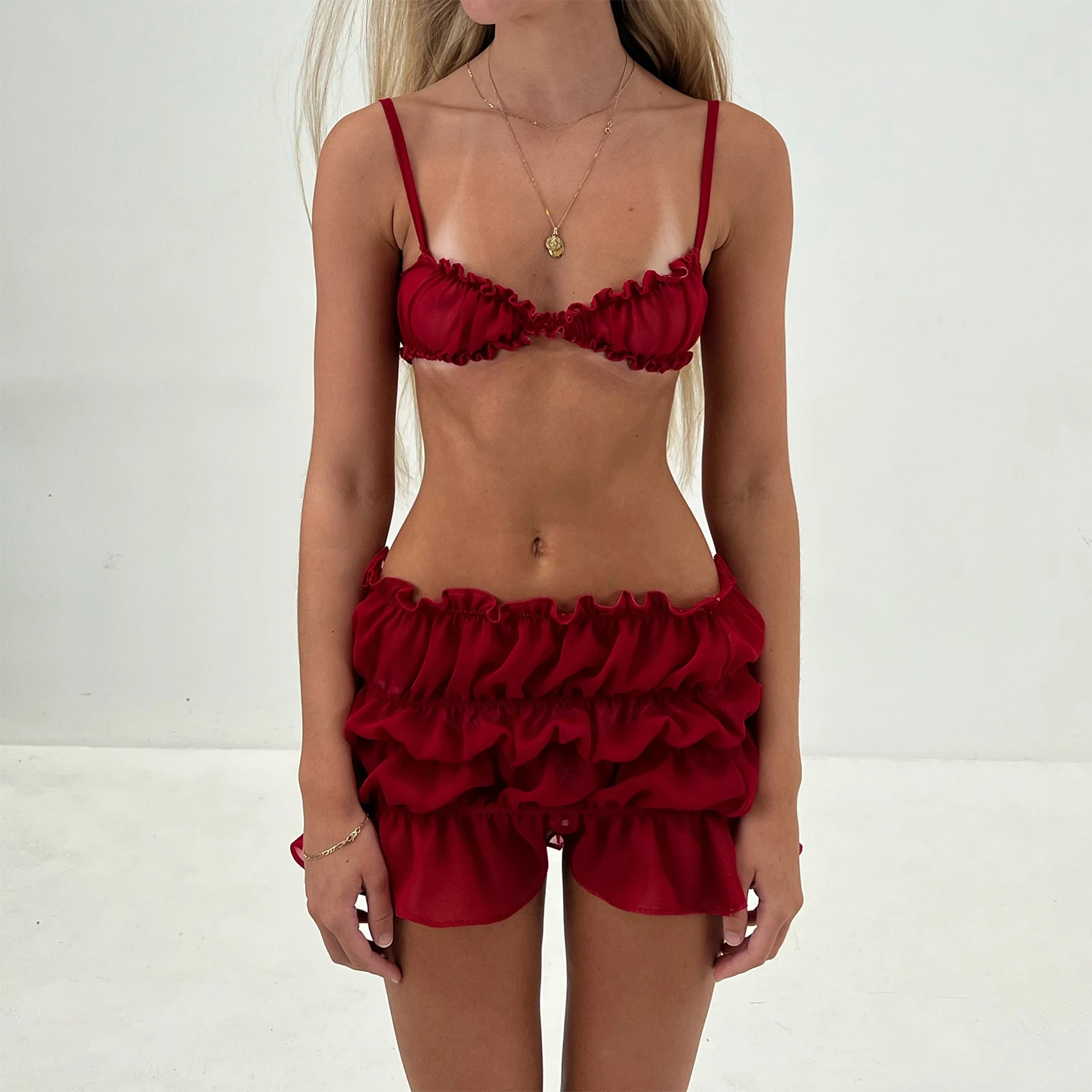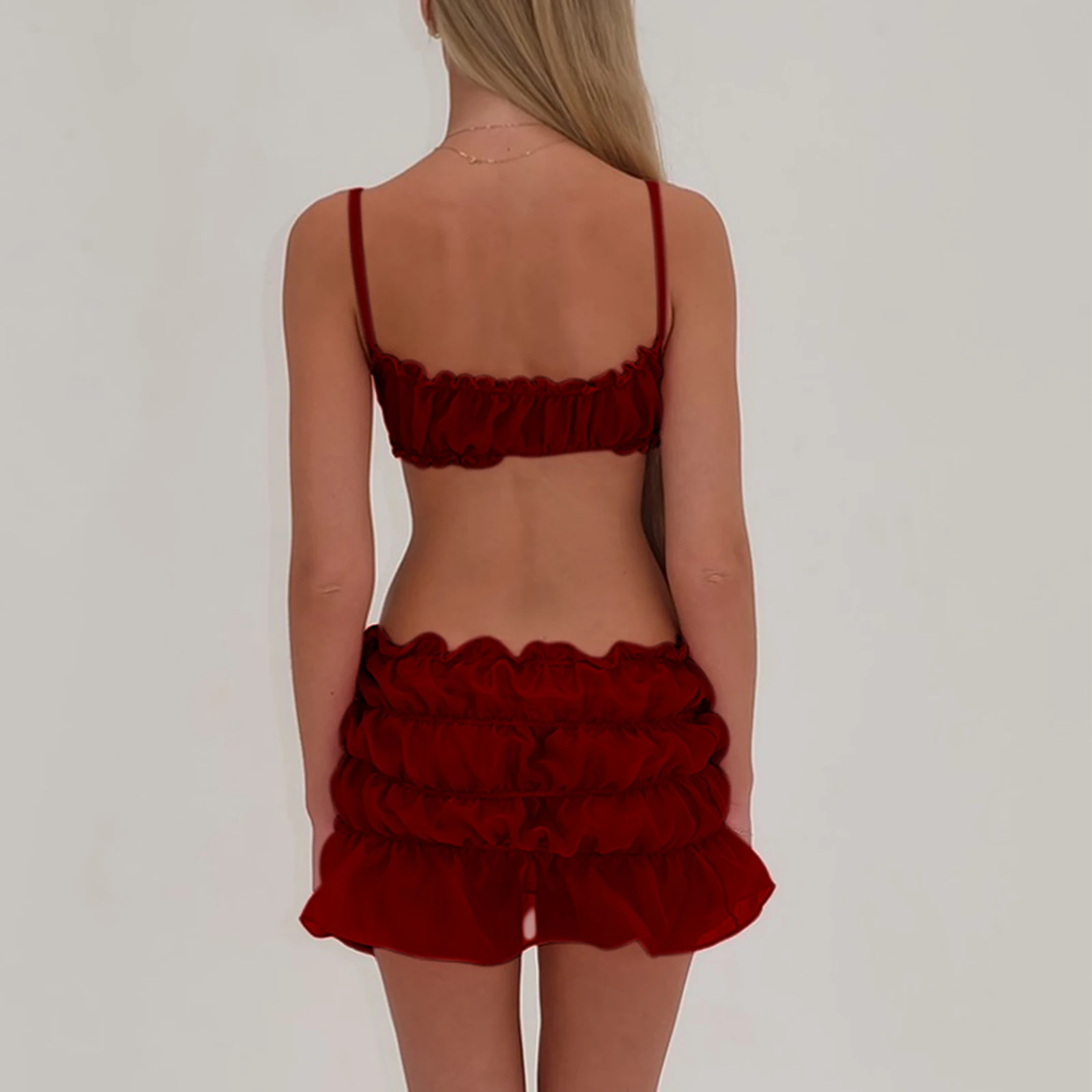 Women's 2 Piece Skirts Outfits Solid Color Spaghetti Strap Frills Sleeveless Cami Tops Mini Skirts Clothes Set