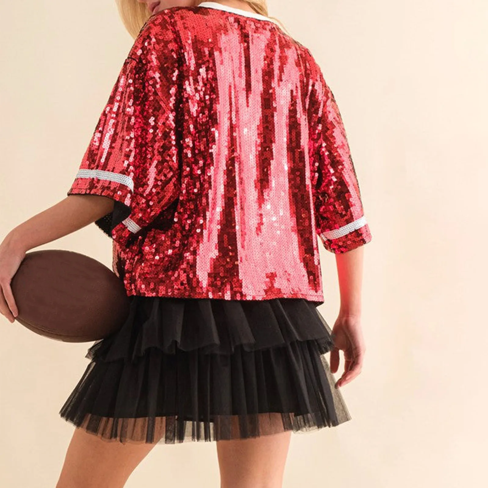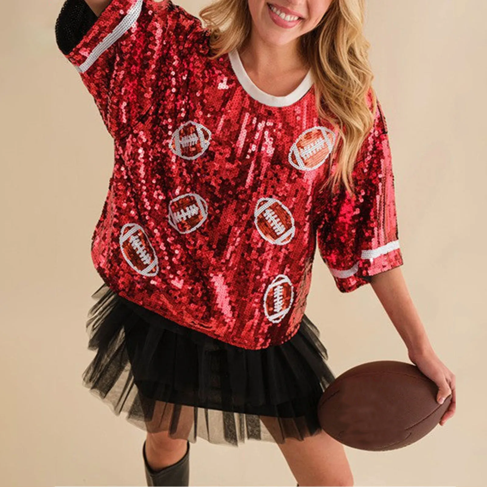 Women Summer Fashion Sequins T-shirt Short Sleeve Crewneck Rugby Print Tops for Party